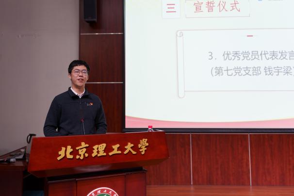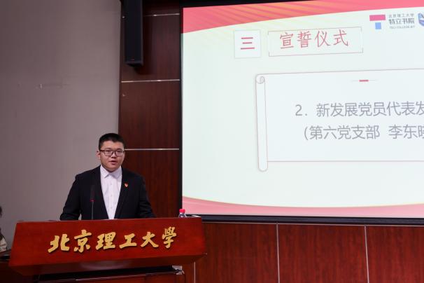 来自第六党支部的李东晓代表新发展党员发言。他表示自己有幸在党的二十大召开之年成为一名光荣的预备党员,更应当从自我做起,真正为学院、为群众办实事,把力所能及的事情做好、做精,把服务他人始终放在心上,继承北理工的优良传统,讲好北理工故事和党员先锋的故事,让所想所行都真正无愧“共产党员”这四个字。