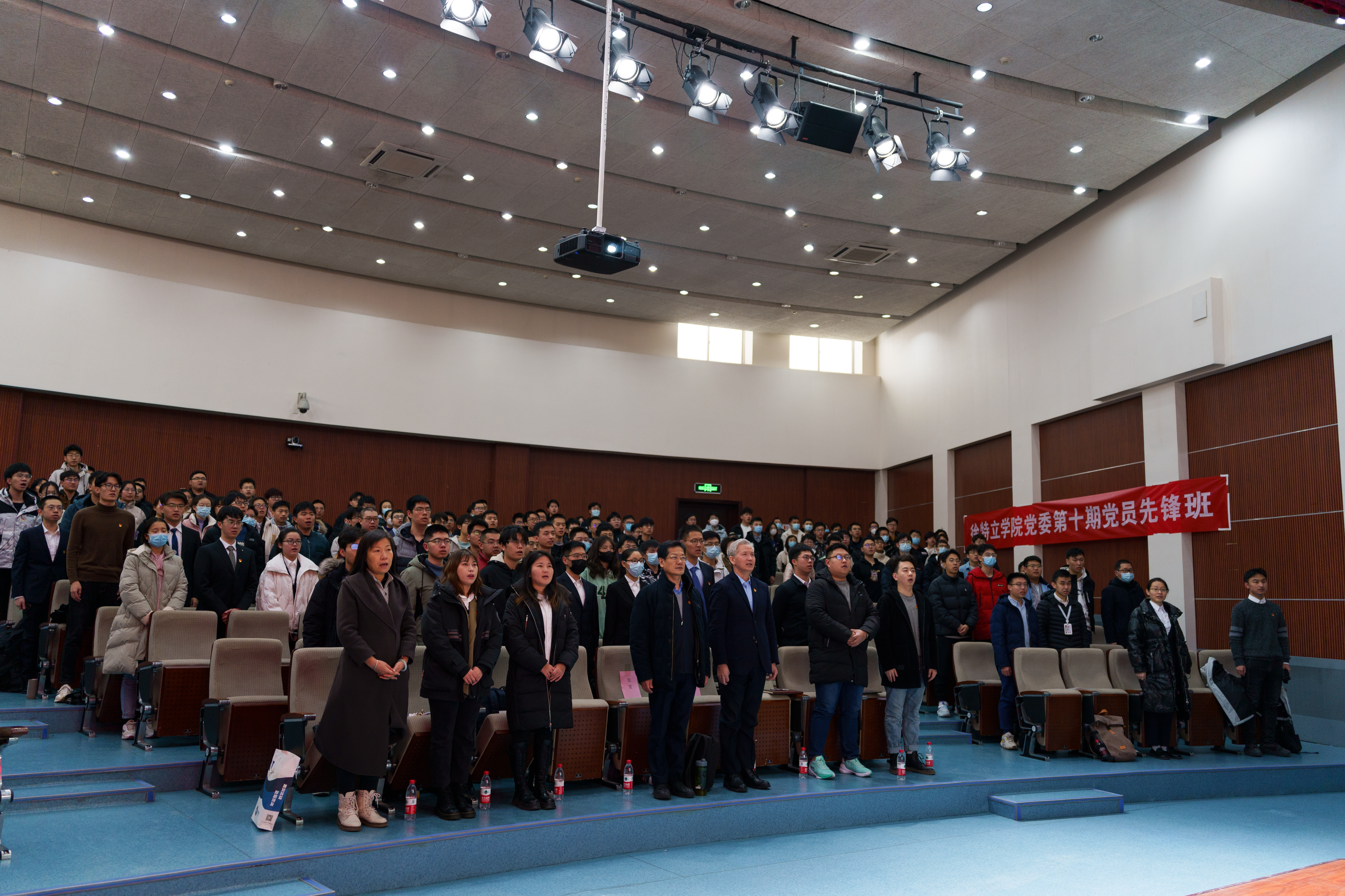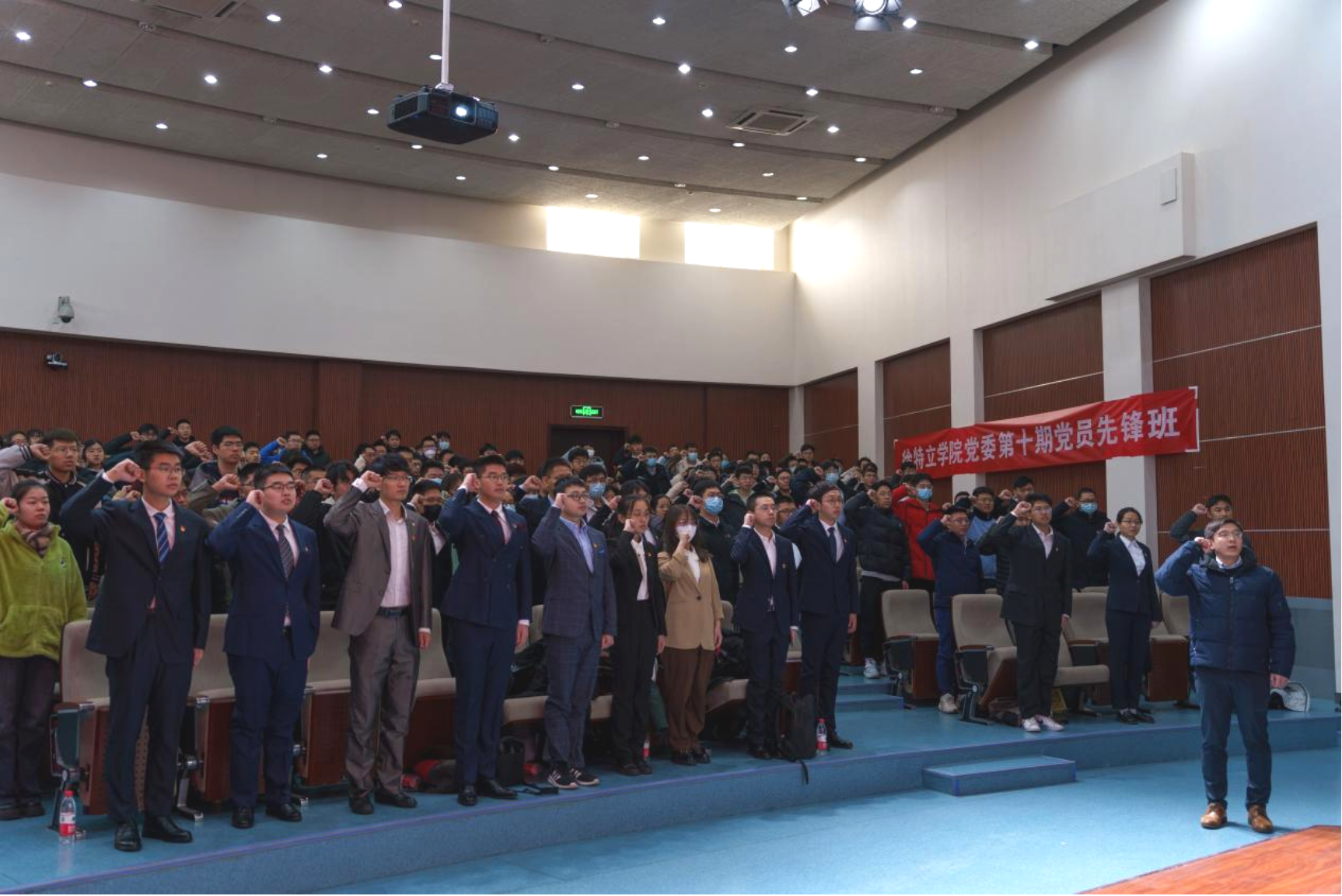 党课结束后,党员宣誓仪式正式开始。李成刚作为领誓人,带领2022年下半年新发展的90余名党员在鲜红的党旗下庄严宣誓,其他党员重温入党誓词。宣誓作为一项光荣的仪式,不仅展现了新发展党员的坚定信念,也鞭策着新党员们牢记入党初心,保持昂扬斗志,用实际行动践行为党之志、为党之心、为党之实。