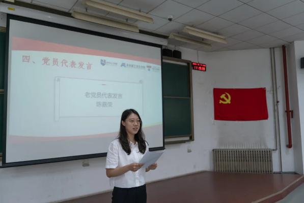 来自第十三党支部的陈嘉荣代表老党员发言。她向新发展党员表示祝贺,并分享了自己的心得。她认为,作为学生党员,把自己建设好,就是最好的建设祖国,作为学生党员,在努力完成学业、学习并运用专业知识的每一天,都在发挥着党员作用。她还表示,加强理论学习,以身作则,积极承担责任,发挥党员的先锋模范作用,是身为学生党员的担当。