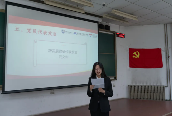 来自第四党支部的武文华代表新发展党员发言。她向党组织立誓,要加强党性修养,提高思想觉悟,用党的理论知识武装自己;同时在实践中完善和发展自己,努力了解社会与国情,增强社会责任感和使命感和适应社会、服务社会的能力,在思想上“入党”。