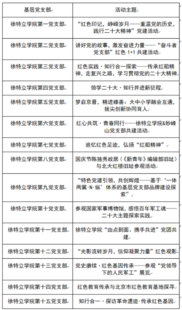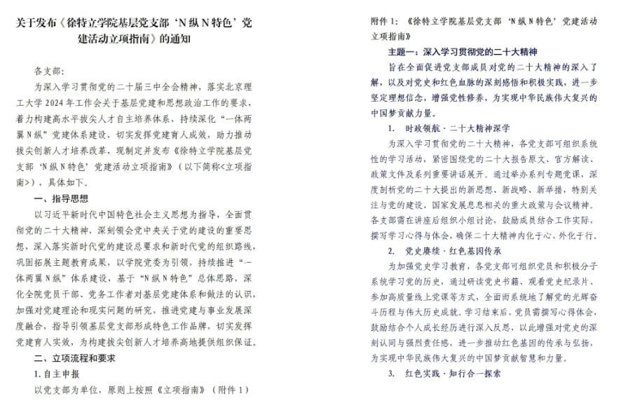 学生工作办公室就联席会上所提出的一系列宝贵建议,切实总结基层党支部工作品牌创建的痛点需求,深入研究党建活动创新点,审议制定了《必威西汉姆联基层党支部“N纵N特色”党建活动立项指南》(以下简称“《指南》”)。《指南》明确了立项的指导思想、流程及要求,为各党支部开展特色党建活动提供了清晰的方向和具体的操作指引。《指南》共分为5个大主题,23个小主题,从“深入学习贯彻党的二十大精神” “赓续红色基因,学习校史院史” “探寻徐老足迹,传承红色教诲” “向优秀党员学习,汲取前行力量” “青春献礼七十五载,党员先锋在行动”等方面多维度覆盖了党建工作的各个工作重点。