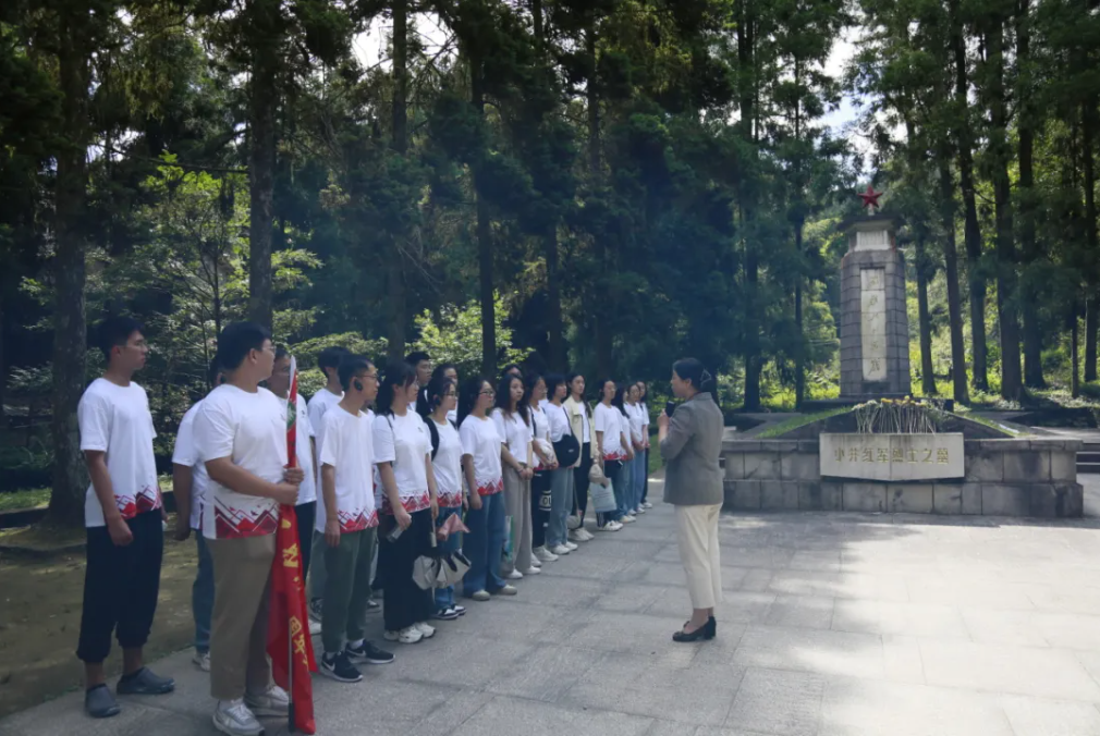 “在第三次反围剿中,敌人突袭了这里,对我军伤病员严刑拷打,逼问红军主力去向,但他们忠贞不屈,最后全部英勇就义,医院也被烧毁......”在小井红军烈士墓前,成员们静默肃立,聆听了一段段感人肺腑的红军烈士英勇事迹,同学们不禁感伤,也深刻理解了先辈的付出,在心中默默坚定了不负韶华的志向。