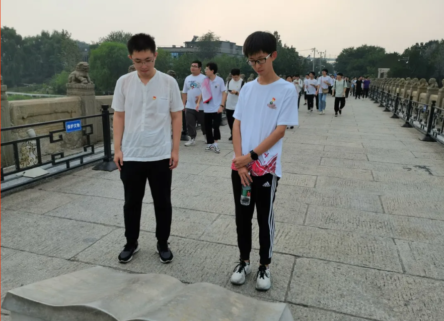 在中国人民抗日战争纪念馆的参观结束后,同学们参观了卢沟桥。水兀自流淌,石狮子沉默不语,站在上面,看着桥石的沟痕,似乎还能听到宛平城守军的呐喊声,看到他们拿着大刀向入侵者的头上砍去。秋风习习,但已换了人间,只有了解民族的伤痛,才能更加理解任务之艰难、前途之光明、指导思想之正确。