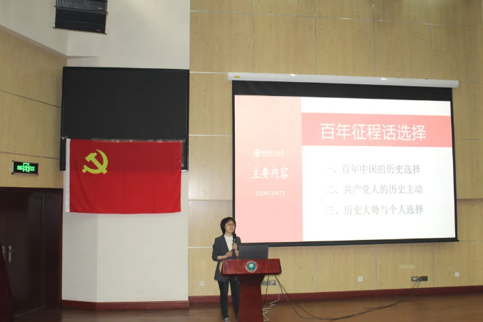 郭丽萍教授在专题党课中,从“百年中国的历史选择”“共产党人的历史主动”“历史大势与个人选择”三个部分进行深入阐述,引导党员同志增进对中国特色社会主义道路历史选择的认识。她在专题党课中指出,中国的今天来之不易,我们要尊重前人选择,珍惜历史选择、做好现实的选择,以正确的历史观认识把握历史大势和规律,以勇于担当的主动精神把握历史主动,勇于做出正确的历史选择,在新征程中主动作为。