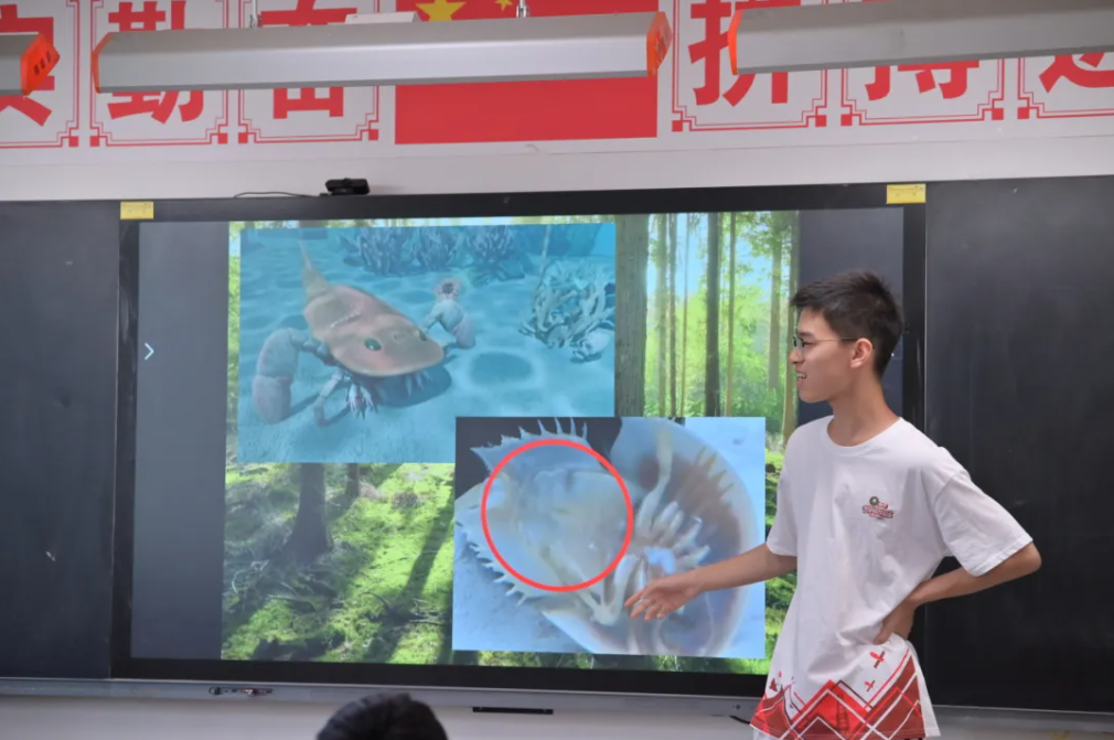 在高中阶段,曾晟恺同学通过比较《海绵宝宝》动画片中的动物哪个更高级引入,带领学生们走过动物从单细胞生物到哺乳动物的进化过程,感受动物个体发育与系统进化之间的密切联系。