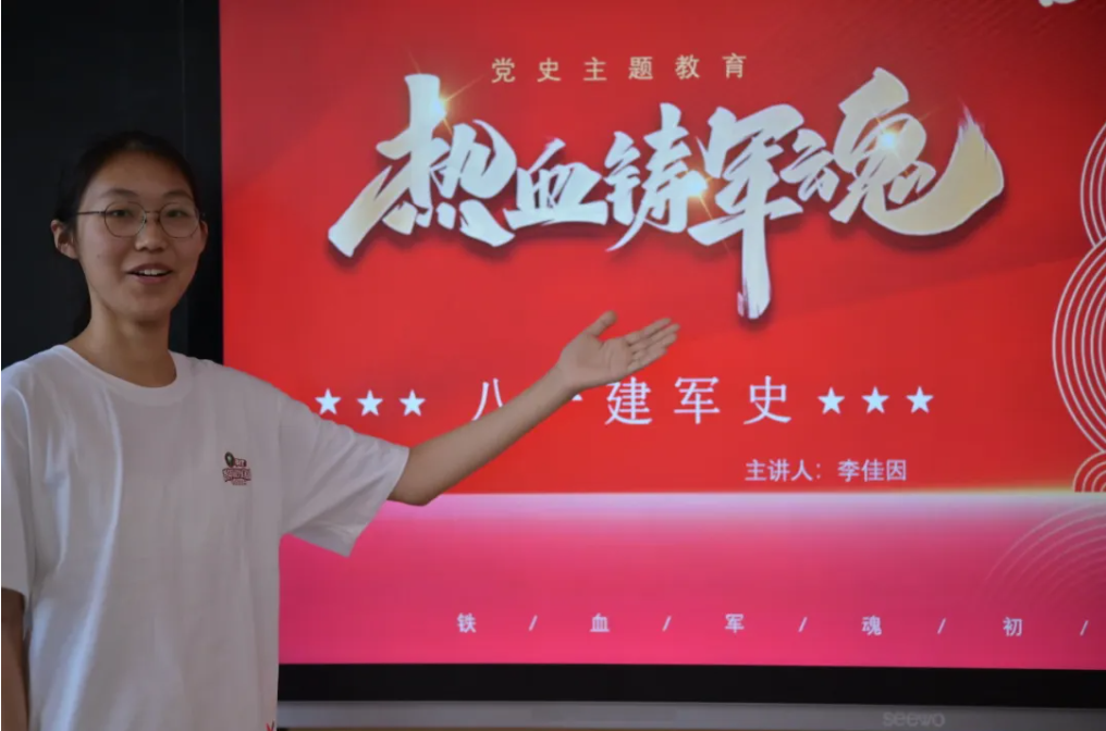 在此基础上,李佳因同学带来了党史教育课程,为同学们讲解了八一南昌起义的红色历史及中国人民解放军的发展历程,通过“向军人致敬”的环节设计,唤起同学们对军人和革命先烈的尊重和感恩之情,厚植爱国主义信念,鼓励同学们坚定志向,将个人理想融入国家发展的伟大征途之中。