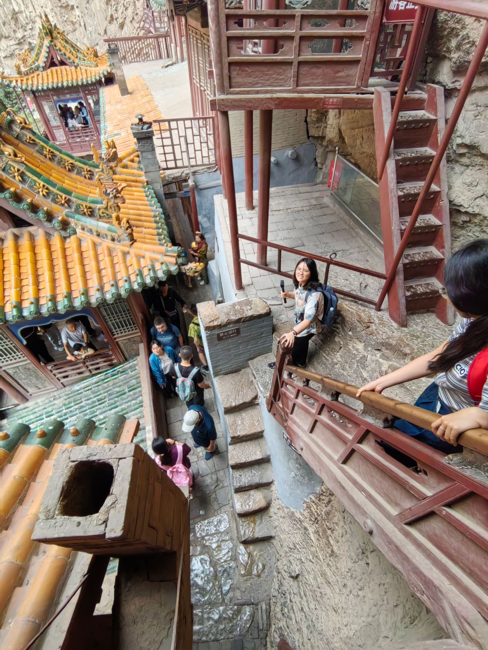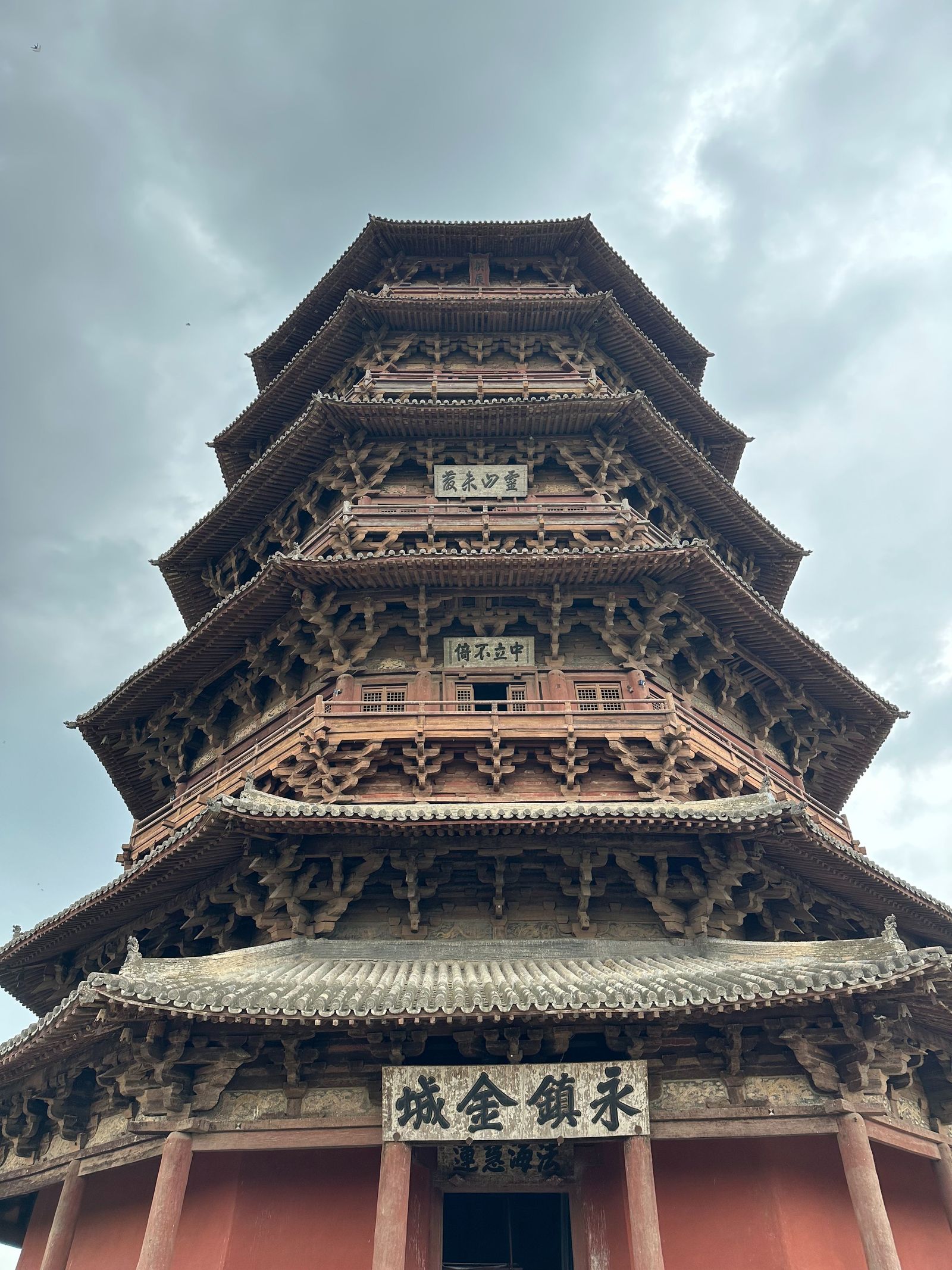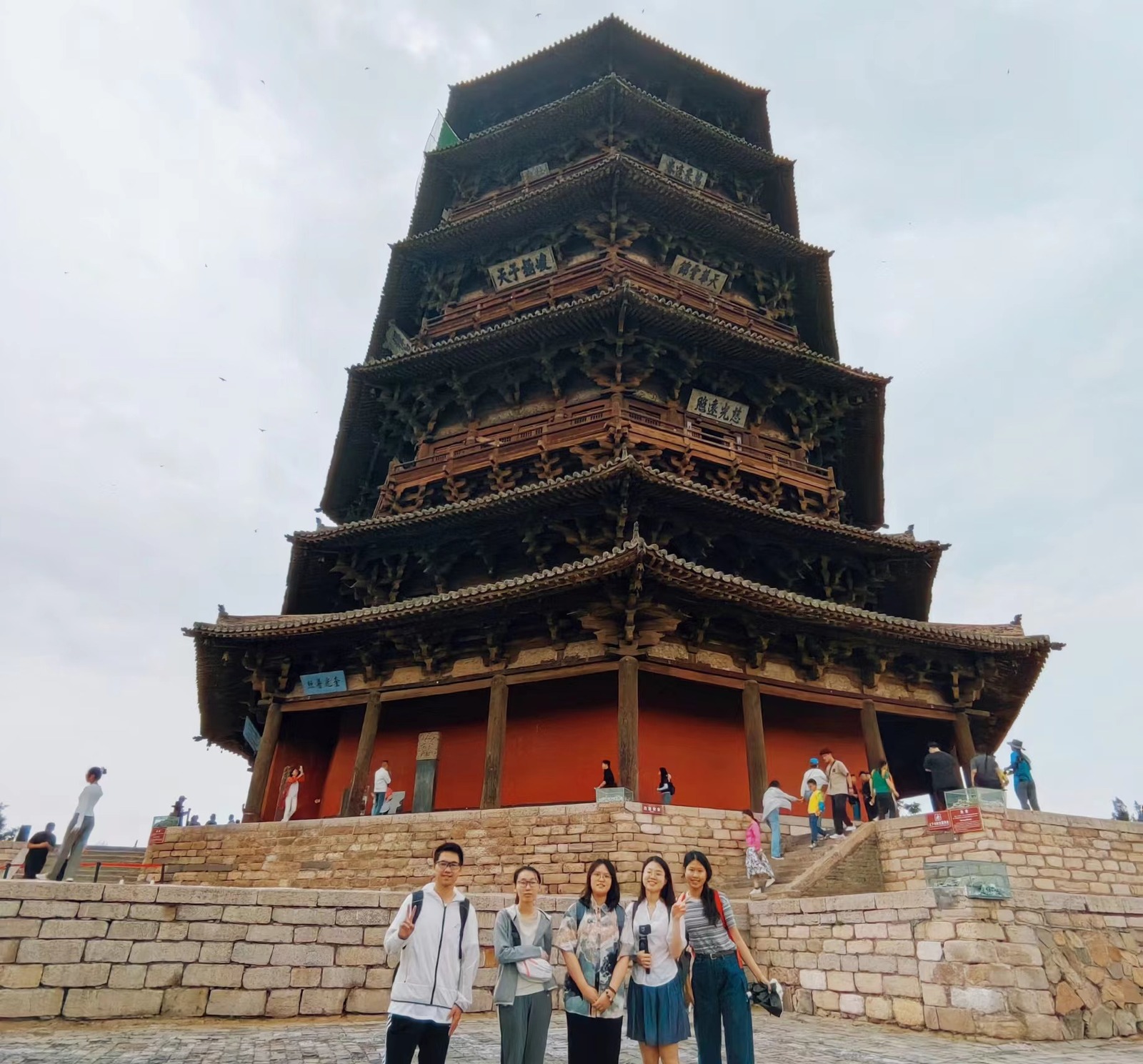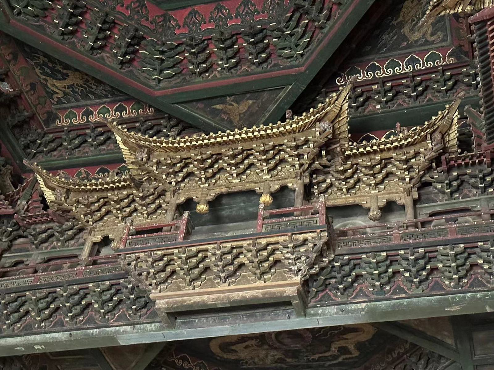 3日,实践团前往朔州,参观了应县木塔。木塔八角五层,屹立近千年,其内外两周、明暗层的设计与梁柱、斜撑、斗拱等受力部件的组合兼具受力作用与结构之美,反映了中国传统木构单体建筑的至高水平,实践团员从中深切感受到了中国古代劳动人民的才干与创造力,增进了对传统木构建筑的结构与美学价值的认识。出应县木塔,实践团继续东行,先后走访浑源县净土寺、悬空寺与永安禅寺,对当地风土壁绘及藻井建制进行考察记录。