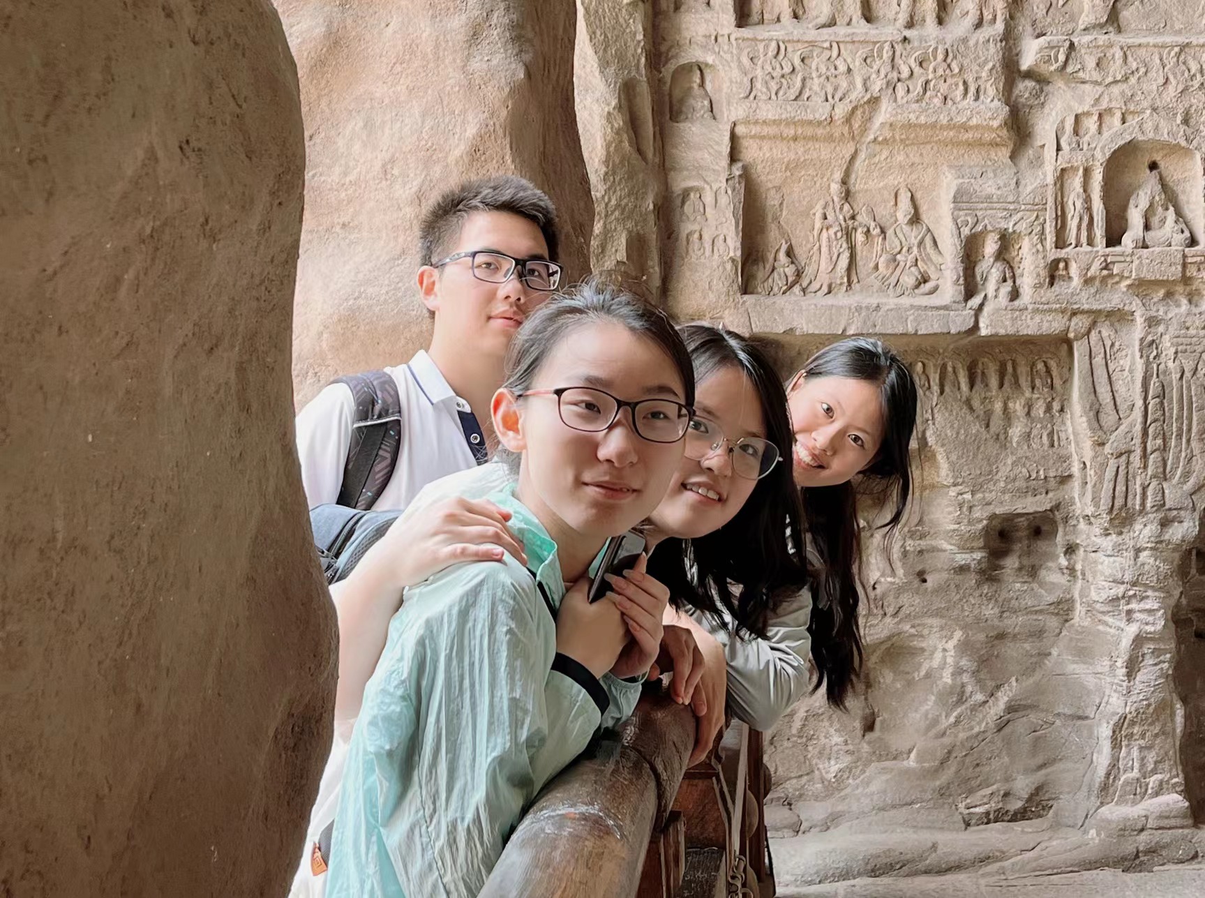 2日下午,实践团前往位于大同西北的云冈石窟。云冈石窟开凿于北魏时期,“凿石开山,因岩结构,真容巨壮,世法所希”。从以北魏帝王为原型的昙曜五窟造像开始,自西向东,造像的风格由犍陀罗逐步汉化,涌现出“二佛并坐”等具有时代特色的题材,折射出北魏建都平城、太和改制、迁都洛阳数十年间民族融合与文化交融的历程。考察团在此进行拍摄记录,并及时分析该古迹的目前开发状况。