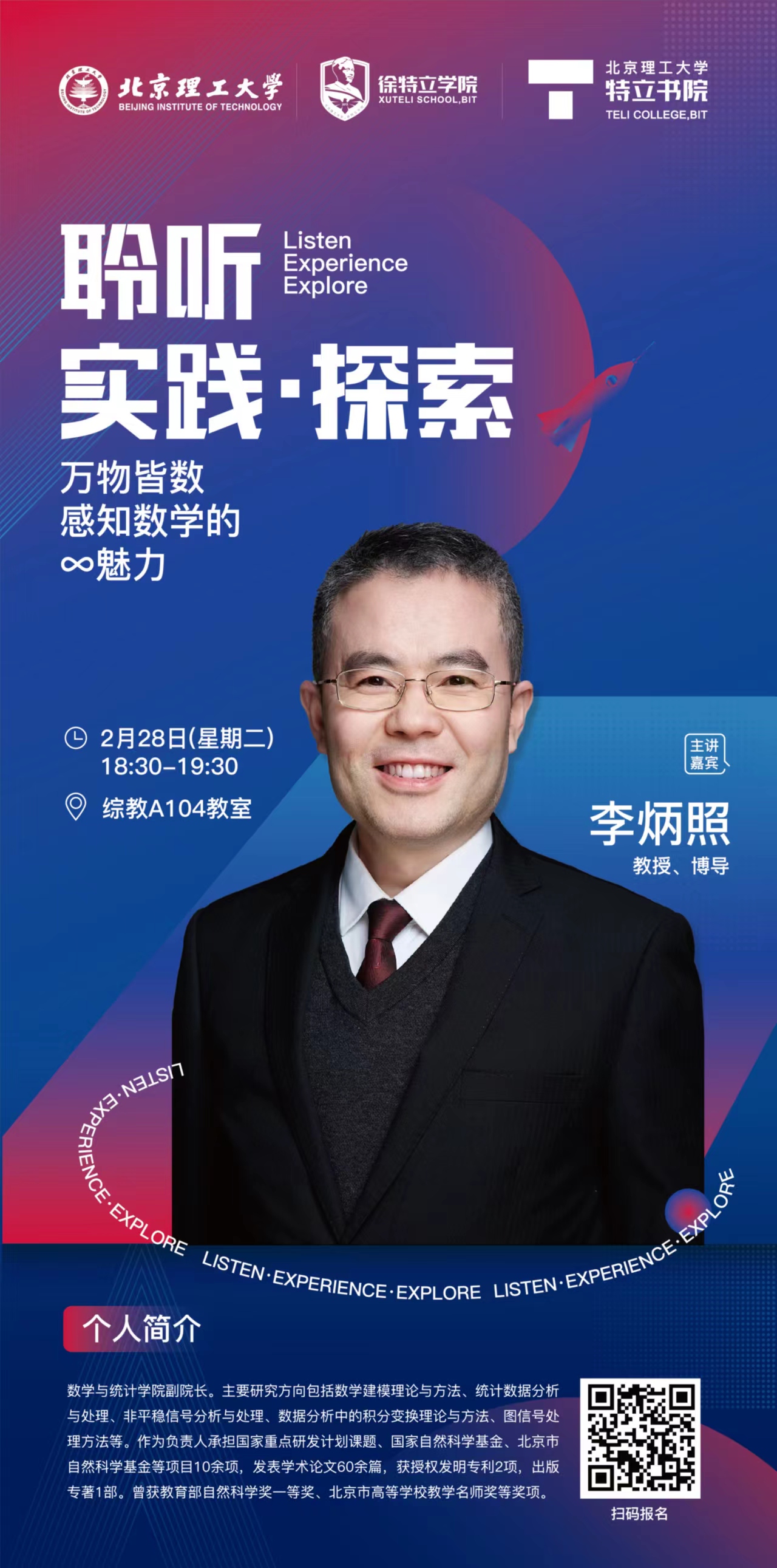 "Listen Experience Explore" Academic Salon Lecture---Sense the Charm of Mathematics 发布日期:2023-02-27 编辑:聂宁宁 审核:李成刚