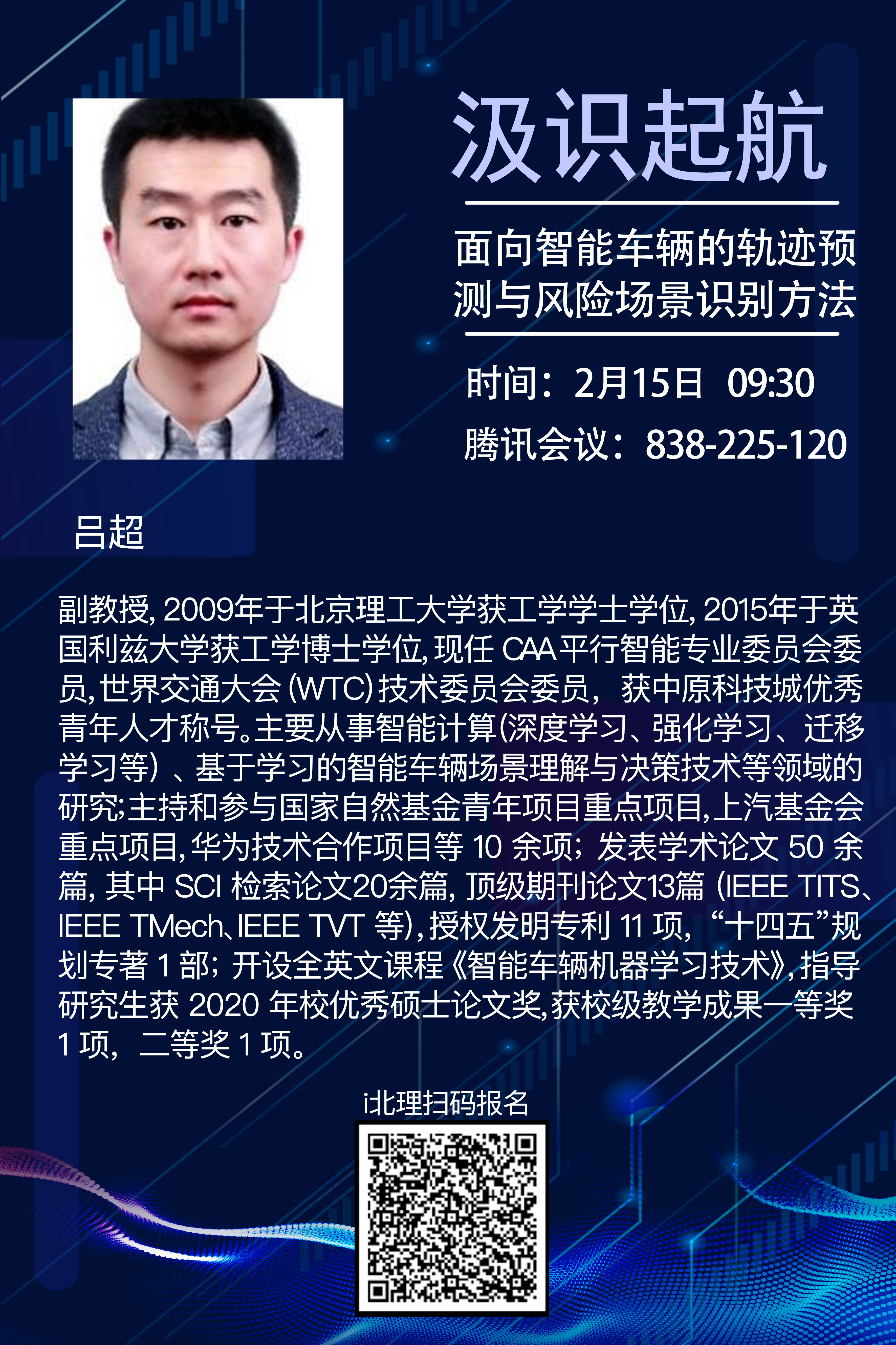 Academic Salon Lecture : Trajectory Prediction and Risk Scenario Recognition Method for Intelligent Vehicles 发布日期:2023-02-12 编辑:张赞 审核:赵昊