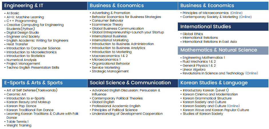 该项目为为期四周的打包制课程,包含工程与IT、数学与自然科学、商业与经济、电子竞技艺术与运动、社会科学与传播、韩国研究与韩语学习等课题方向。报名项目的同学每人最多选3门课不超过9学分,每15课时记1学分。