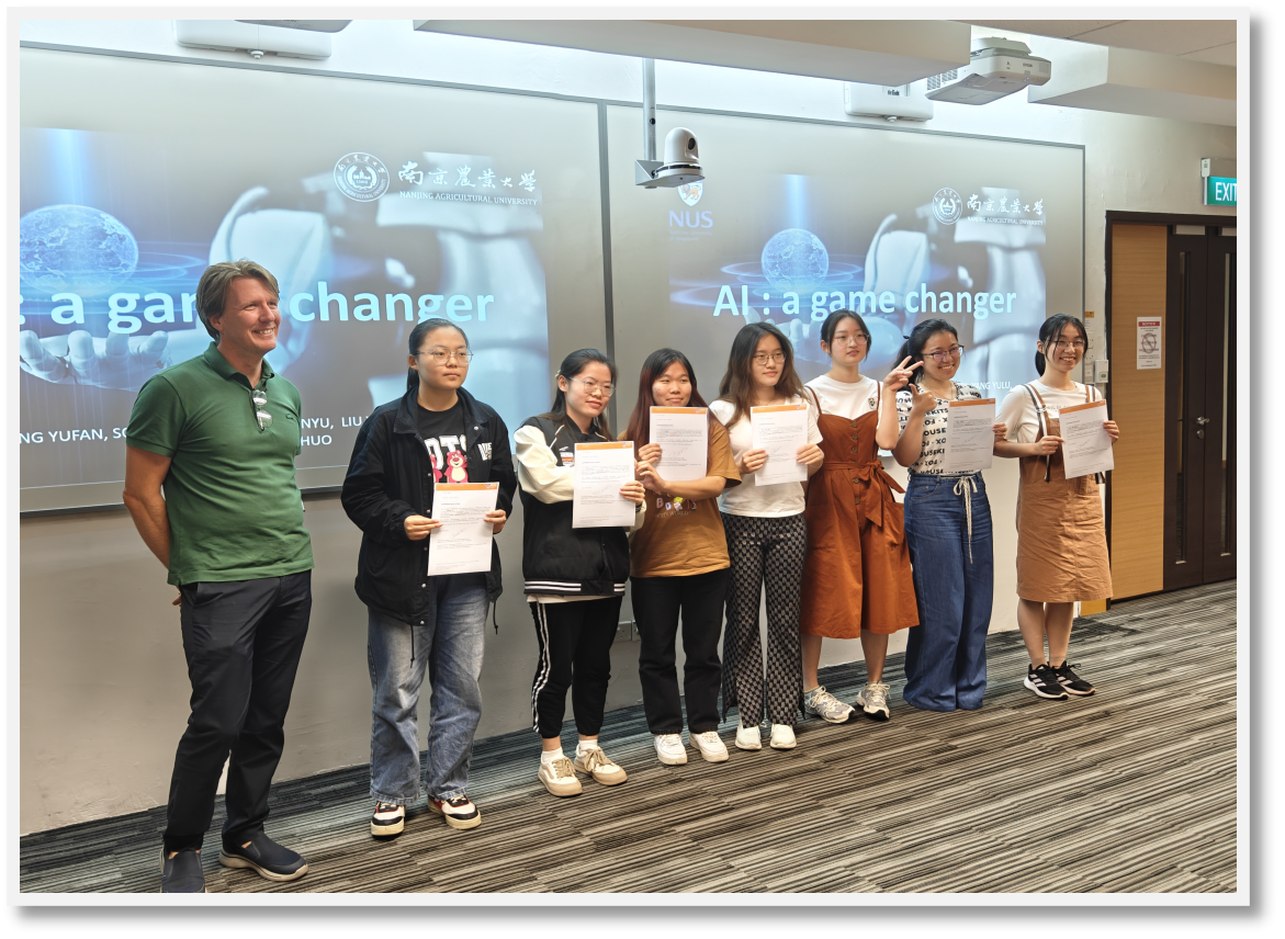 新加坡国立大学寒假课程结束后,授课教授根据结业汇报各小组的完成情况,评选最佳小组,并为最佳小组成员颁发优秀学员证明。