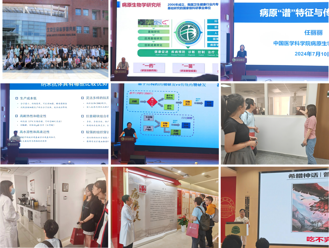 7月10日,同学们前往中国医学科学院病原生物学研究所,深入了解了病原学研究与临床医学的最新进展。上午,同学们依次聆听了舒跃龙、任丽丽、杨威、崔胜带来的专题报告《病原所基本介绍》《“病原‘谱’特征与传染病防控”》《抗体药物》《“发现新药物靶标,原创设计抗病毒药物”》,从病原体的遗传多样性对疾病传播的影响,到合成抗体和计算抗体的制备方法,再到如何分子层面寻找攻克病毒的新途径,同学们对医学科研的严谨性和医工交叉的创新性有了更深的认识。下午,同学们参访了北京协和医院校史馆、病历展和转化楼,感受到了浓厚的协和的历史底蕴,学习了严谨治学的态度和救死扶伤的初心,了解了生物标志物在疾病诊断中的应用和样本保存标准。聆听了冷泠、吴志宏、黄超兰等三位老师关于工学知识如何助力临床医学研究的专题报告,展现了交叉学科在医学创新中的广阔前景。