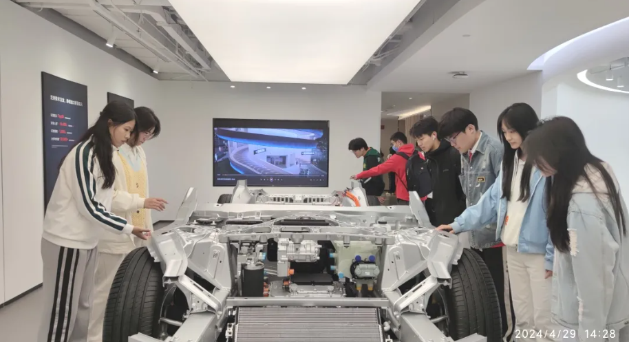 学生与工程师交流小米SU7底盘创新设计