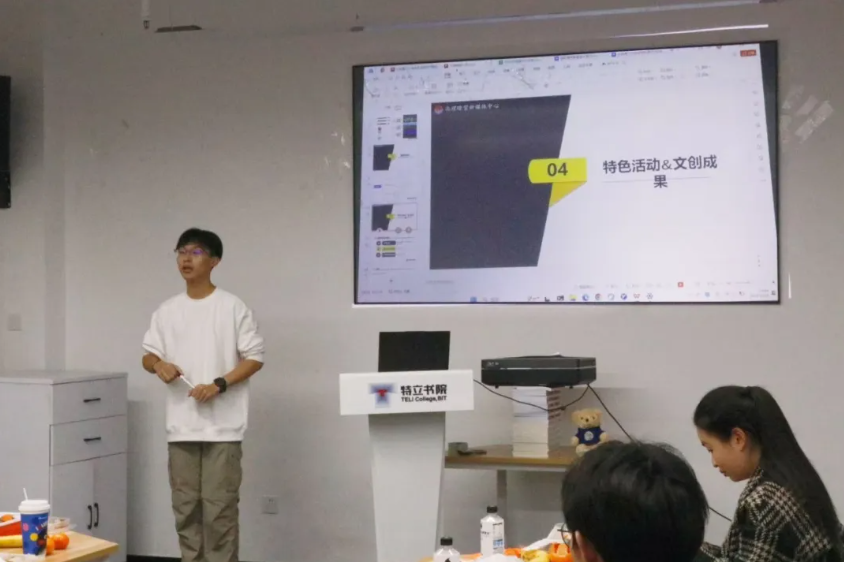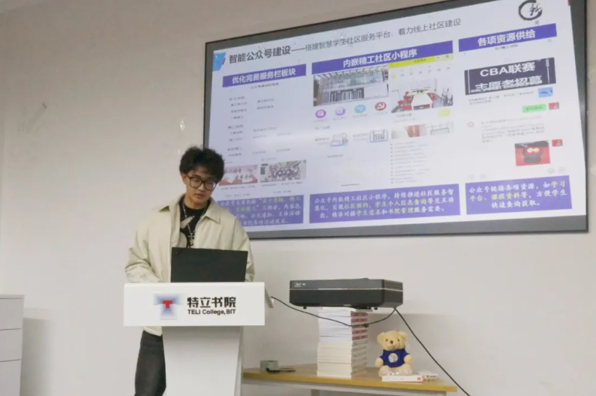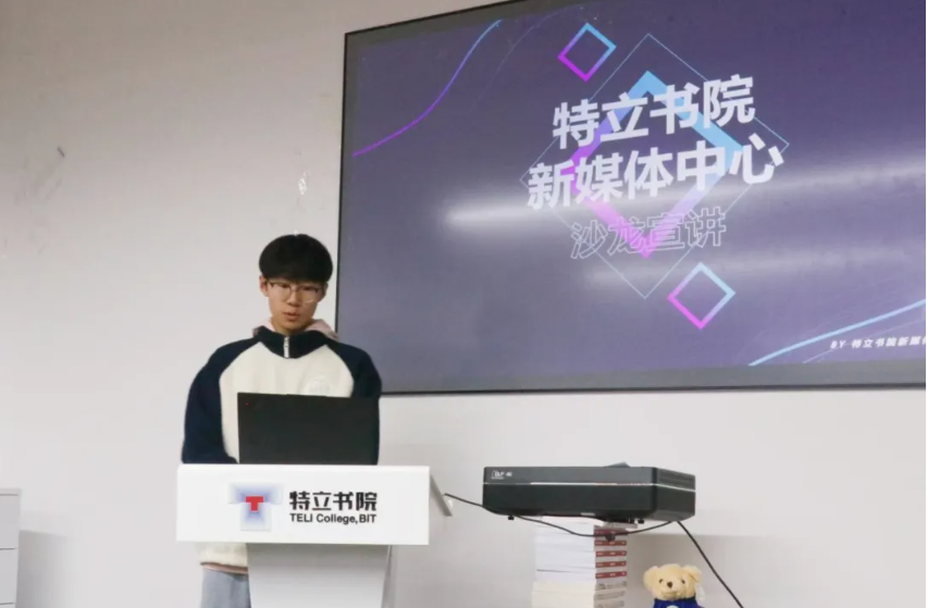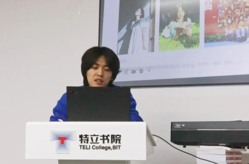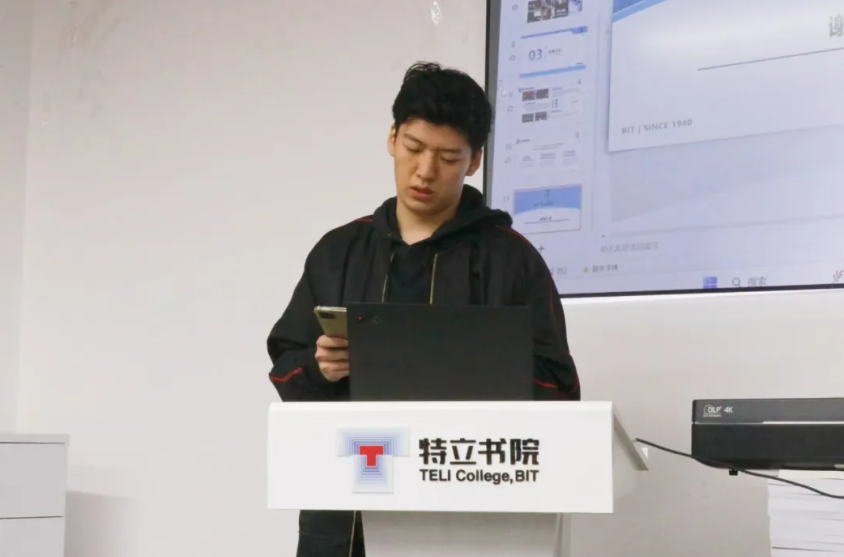 特立书院新媒体中心代表,2022级本科生傅渲淇上台分享。他介绍了特立新媒体中心的各部门职能及其分工,以及在创意推送制作、视频拍摄领域的成果与经验。傅渲淇展示特立新媒的一系列优秀作品,如创意视频“延时北理”“骑行北理”“飞”,活动纪实“2024迎新”“徐特立舞台剧”等。上述视频从各方面展示了特立学子的心声和风貌。在“BIT卓然特立”公众号运营方面,傅渲淇介绍了特立新媒支持学院十周年院庆、校区搬迁、毕业典礼、新生运动会等重要活动拍摄和新闻制作的经验,并展示了日常制作的一系列创意推送,如“特立青年说”系列专访、“蓝色的热忱”艺术作品展示、“特立·一格”校园摄影等。