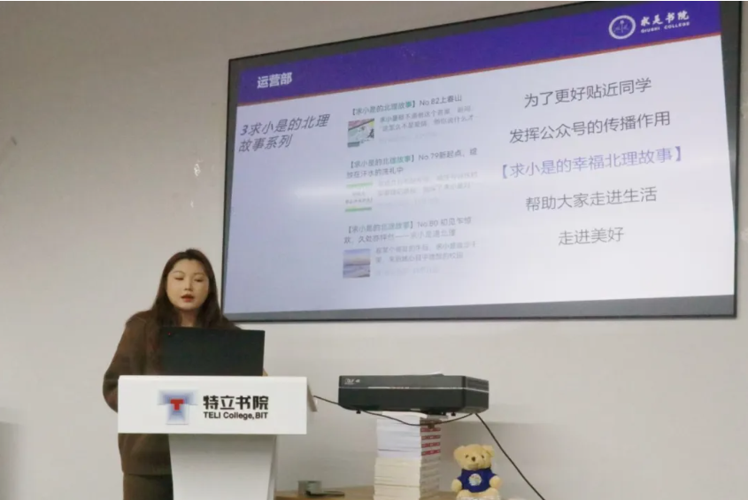 箫阳代表精工书院新闻中心上台分享。他对精工书院新闻中心进行了体量规模、主要工作与组织架构等方面进行了简要的介绍。重点分享了精工书院公众号的特色栏目,栏目“每日一拍“聚焦于记录校园的美丽分光,栏目”我心安处“以长期征集同学们家乡的照片,承载了北理学子对家乡深沉的爱与乡愁,”“新闻知识竞赛”则聚焦于同学们丰富知识,提升自我。