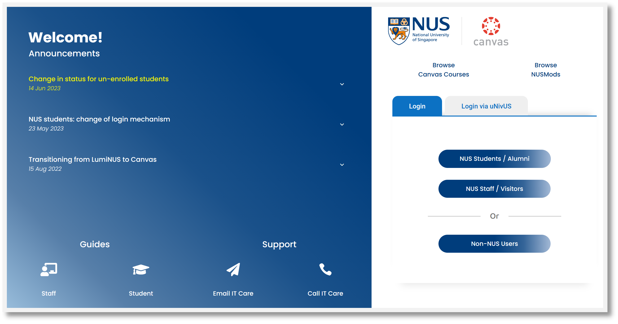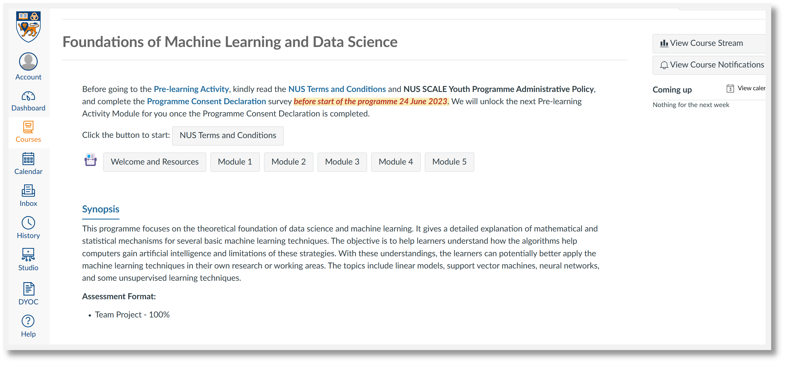 NUS SCALE将在其在线学习平台 Canvas 上为学员建立个人账户。每位学员都将使用自己的 Canvas 账户接收学校通知、访问讲师分配的学习任务、提交作业和下载课程资料。