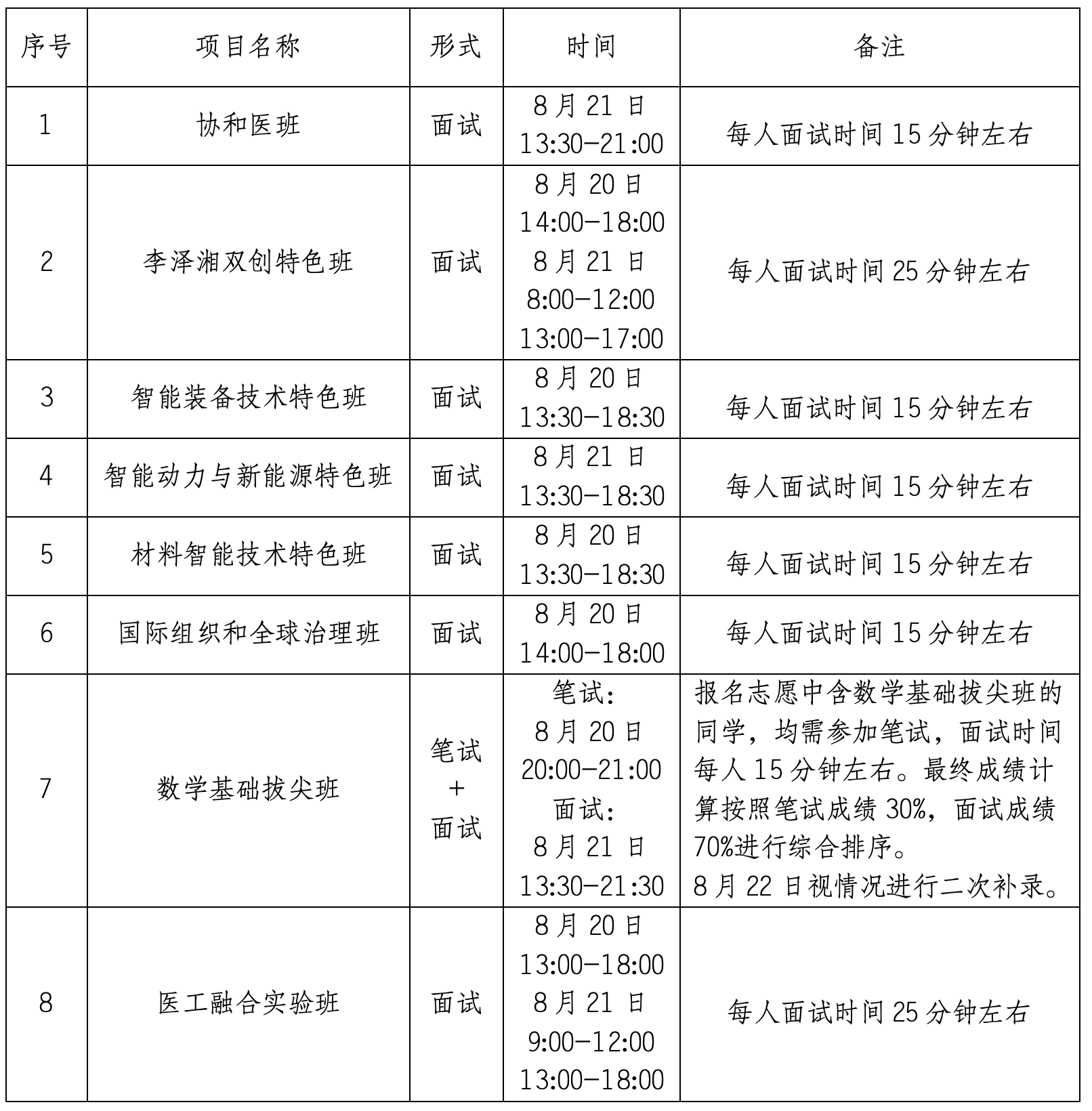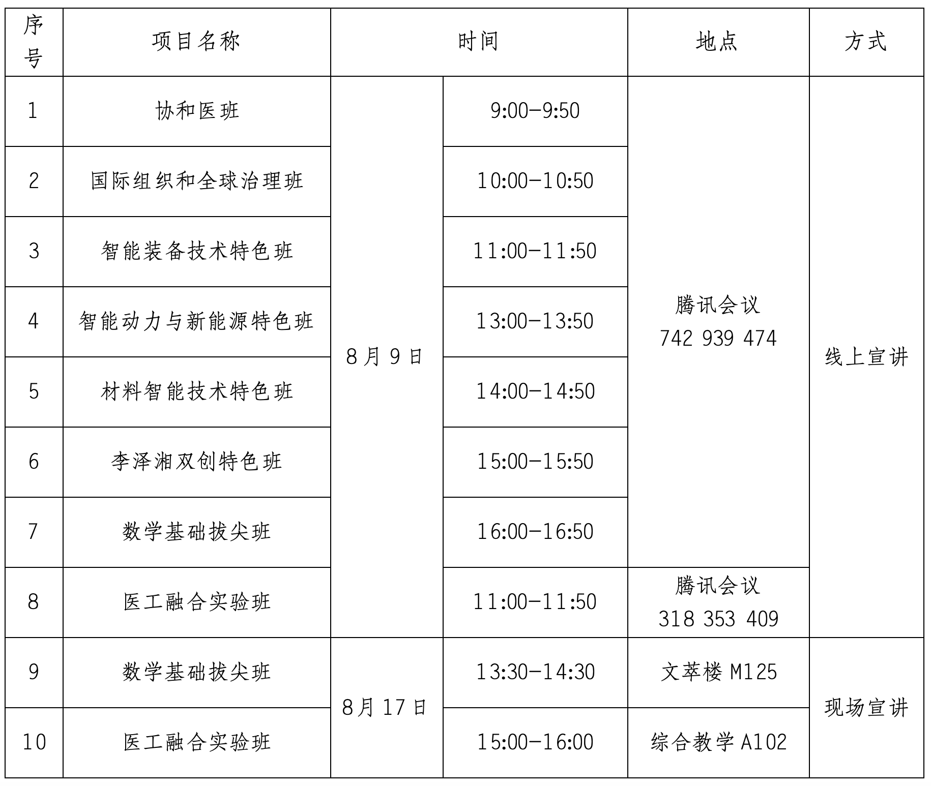 各拔尖创新人才培养项目将在8月9日集中开展线上宣讲,介绍各专业办学优势和人才培养政策,部分项目还将在8月17日组织现场宣讲,具体安排详见下表: