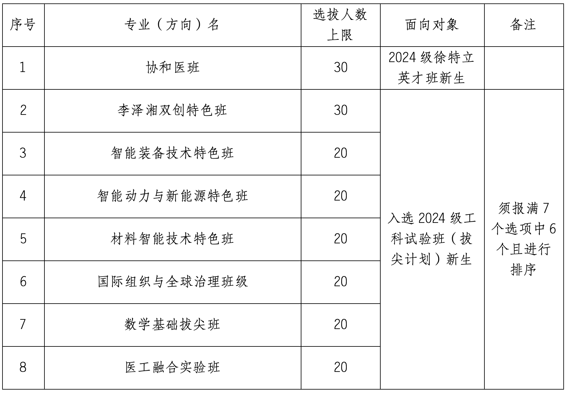 学校面向2024级本科新生开展协和医班、李泽湘双创特色班、徐特立特色英才班、数学基础拔尖班、医工融合实验班等8个专业(方向)拔尖创新人才培养项目的选拔工作,共计划选拔180人,详见下表:
