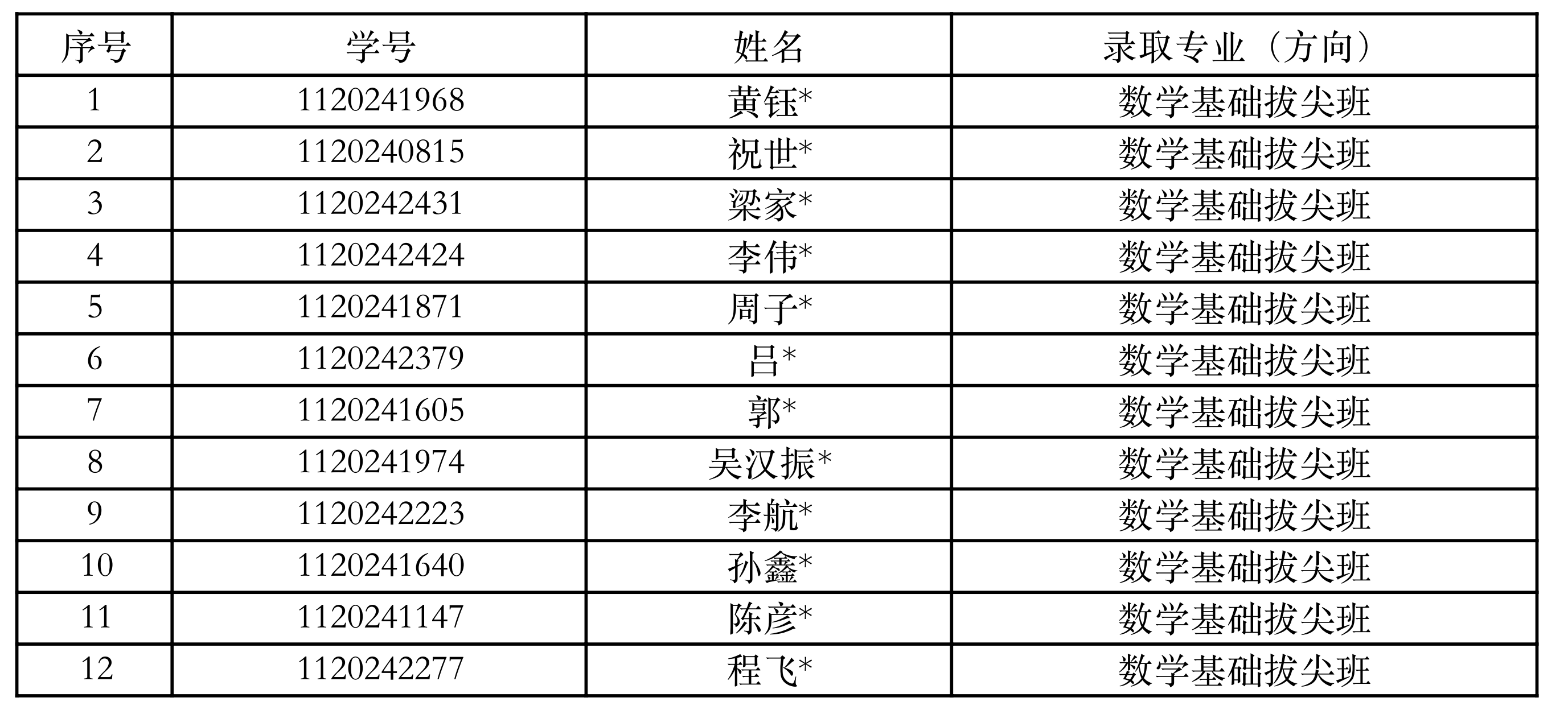 2024级本科新生数学基础拔尖班选拔录取名单公示