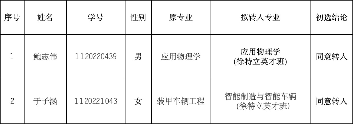 根据学校教务部2023-2024学年第一学期转专业工作安排、《必威西汉姆联/未来精工技术学院2023-2024学年第一学期接收转专业工作实施方案》,本着公正、公平、公开的原则,经过报名、资格审查、面试考察等流程,现将转专业学生初选结果公示如下: