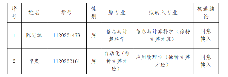 根据学校教务部2023-2024学年第二学期转专业工作安排、《必威西汉姆联/未来精工技术学院2023-2024学年第二学期接收转专业工作实施方案》,本着公正、公平、公开的原则,经过报名、资格审查、面试考察等流程,现将转专业学生初选结果公示如下: