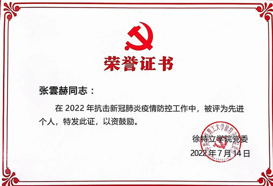 立志报国是张雲赫从小的志向,他每周坚持参与“青年大学习”,认真学习领悟习近平新时代中国特色社会主义思想。2021年2月,他递交了入党申请书,在疫情最严峻的时刻,他主动报名学校疫情防控志愿者,冲锋在前,认真开展疫情防控志愿服务,获得学院2022年抗击新冠肺炎疫情防控工作先进个人荣誉称号,2023年10月他如愿成为一名中共党员。