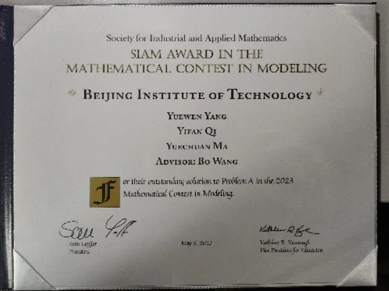 锲而不舍,金石可镂。经过了接近一年的沉淀与积累,杨跃文如愿在2023年美国数学建模大赛获得了最高荣誉特等奖(O奖,1%以内),同时获得了美国工业与应用数学学会颁发的SIAM联名奖。