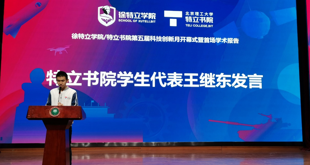 特立书院新生代表王继东发言,他介绍了线上入学教育和入学三周以来的特立书院见闻。一方面,他为成为一名特立学子感到骄傲与自豪;另一方面,他感恩老师和同学,积极思考,努力从科技创新月中提升自我。