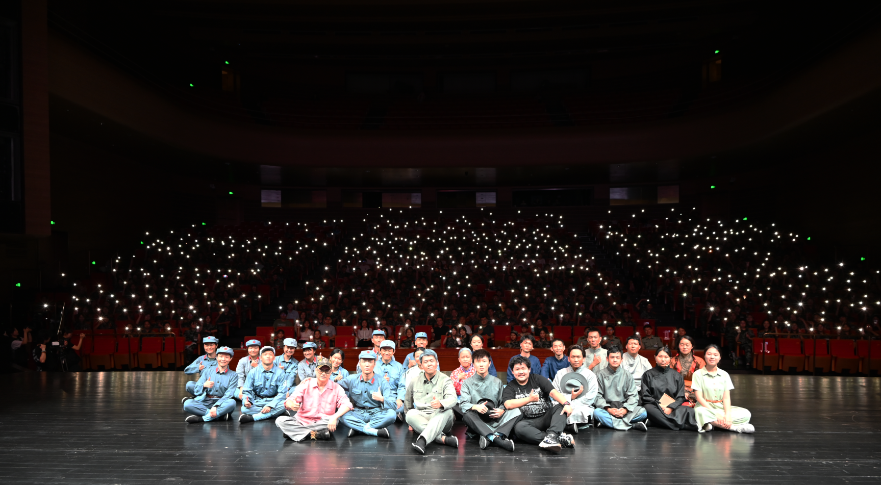 “为了人民的利益,前进——!”聚光灯下,“徐特立”向着远方振臂高呼,眼中的泪光是对同志牺牲的悲痛,坚定嘹亮的话语则鼓舞着队伍重振信心,接续奋斗。这一幕将整场舞台剧引向高潮,观众席掌声雷动!