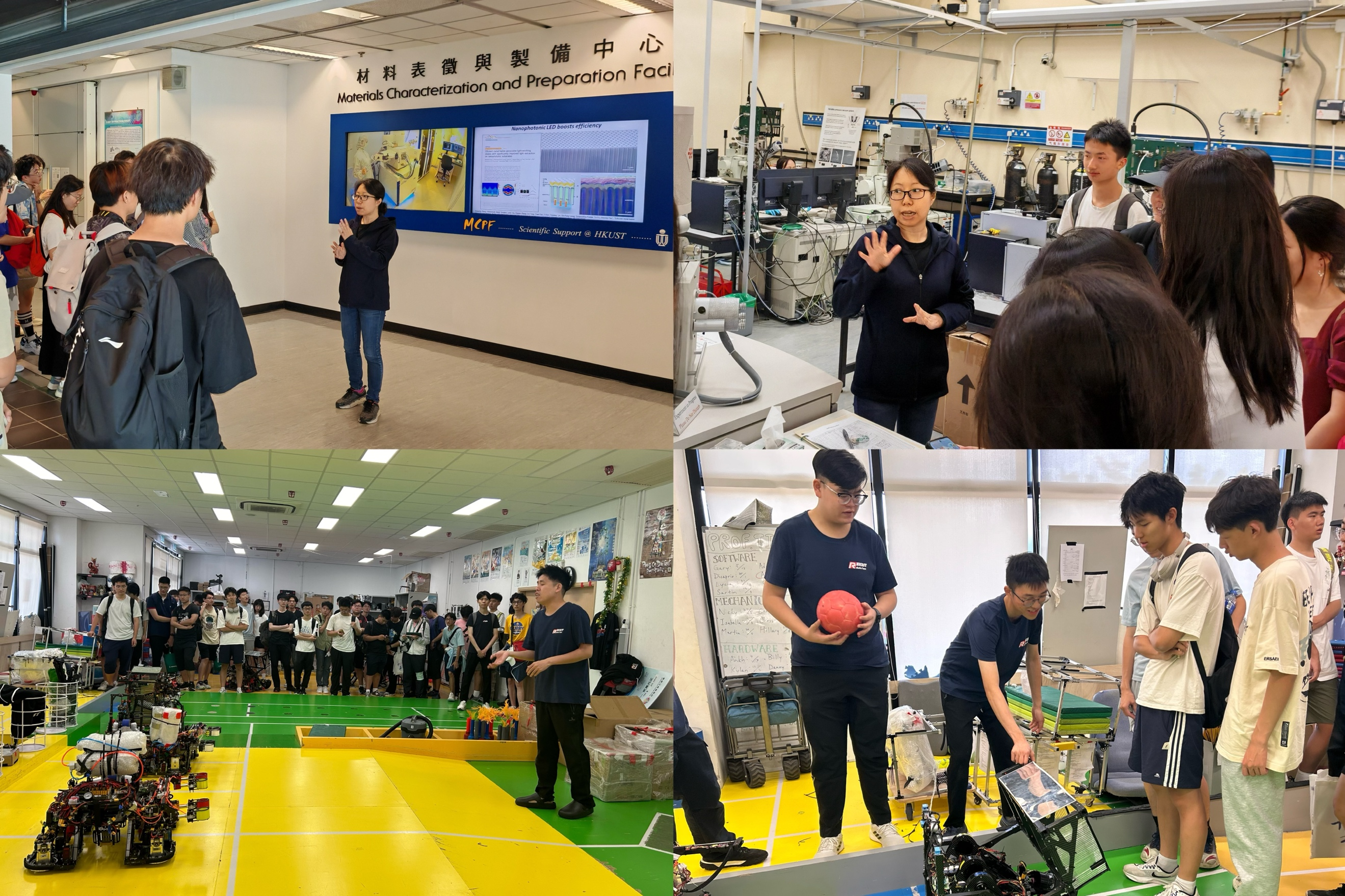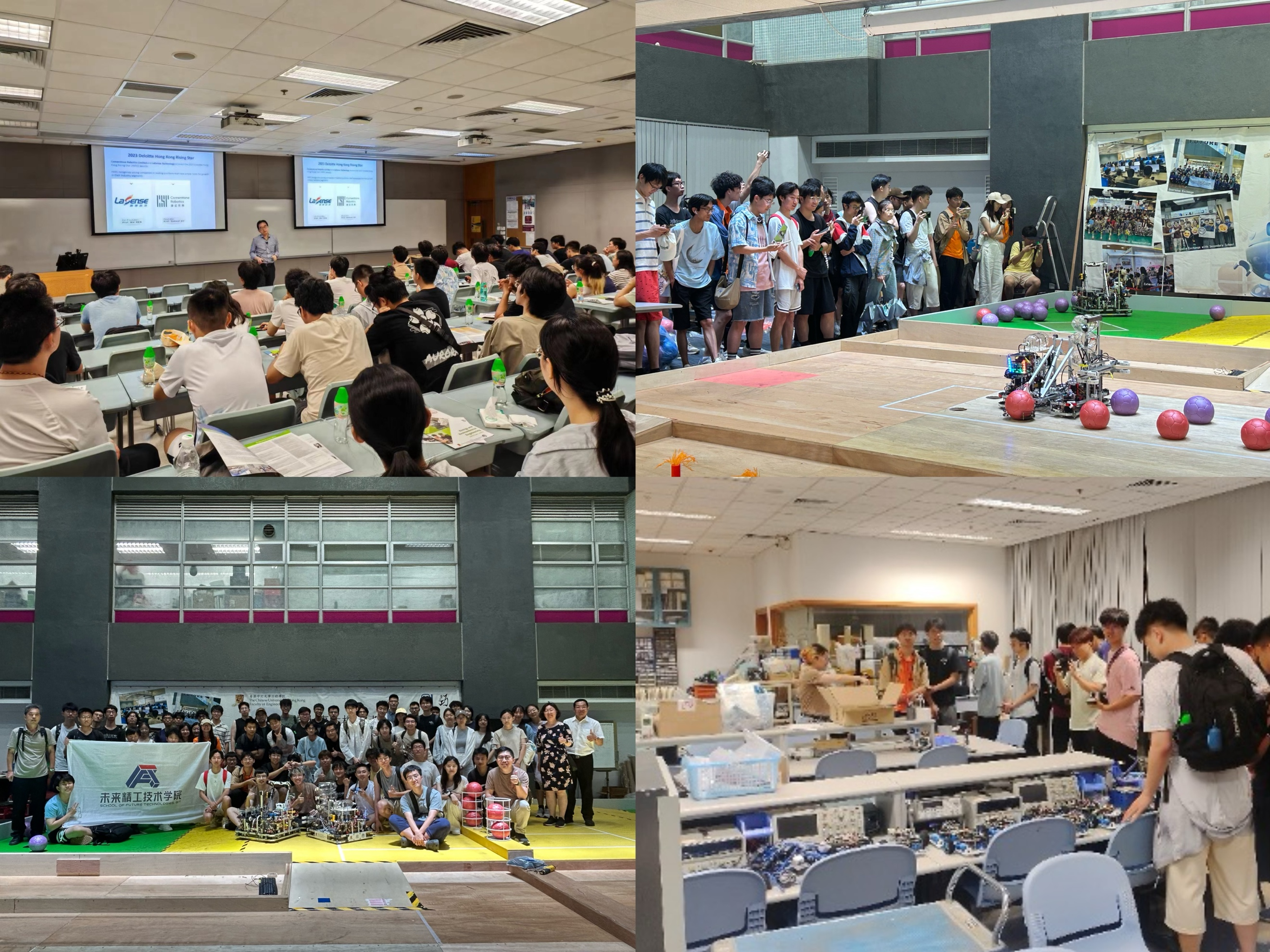 接下来,同学们参观了机器人实验室,实验室内展示了自动化机器人、智能机械臂和自主移动机器人等先进的机器人技术。港中文机器人队正在为国际赛事ROBOCON进行赛前准备,队员向同学们展示了比赛中颗粒归仓竞技赛和机器人排球挑战赛两个环节。同学们与队员进行了深入的交流,并亲自操控体验了实际操作环节。