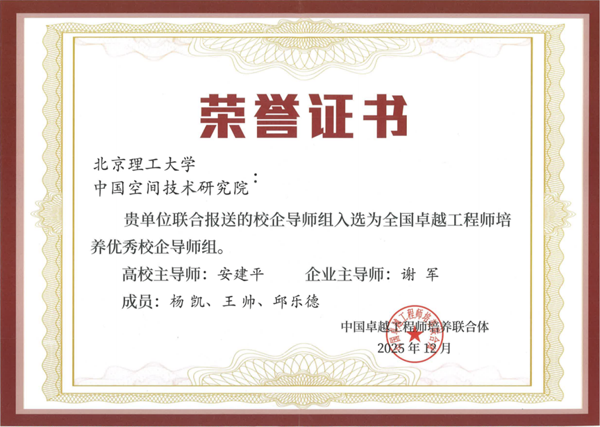 近期中国卓越工程师培养联合体公布了2025年卓越工程师培养优秀案例、优秀校企导师组及优秀实践成果获奖名单。由我校王博副校长牵头申报的《卓越工程师校企协同“6+1”培养体系构建与实践》获优秀案例(全国20项);安建平教授与中国空间技术研究院谢军研究员组成的导师组获优秀校企导师组(全国10组),这也是继2024年机械与车辆学院闫清东教授与中国北方车辆研究所李春明院士组成的导师组获优秀校企导师组之后,我校再次获该荣誉。