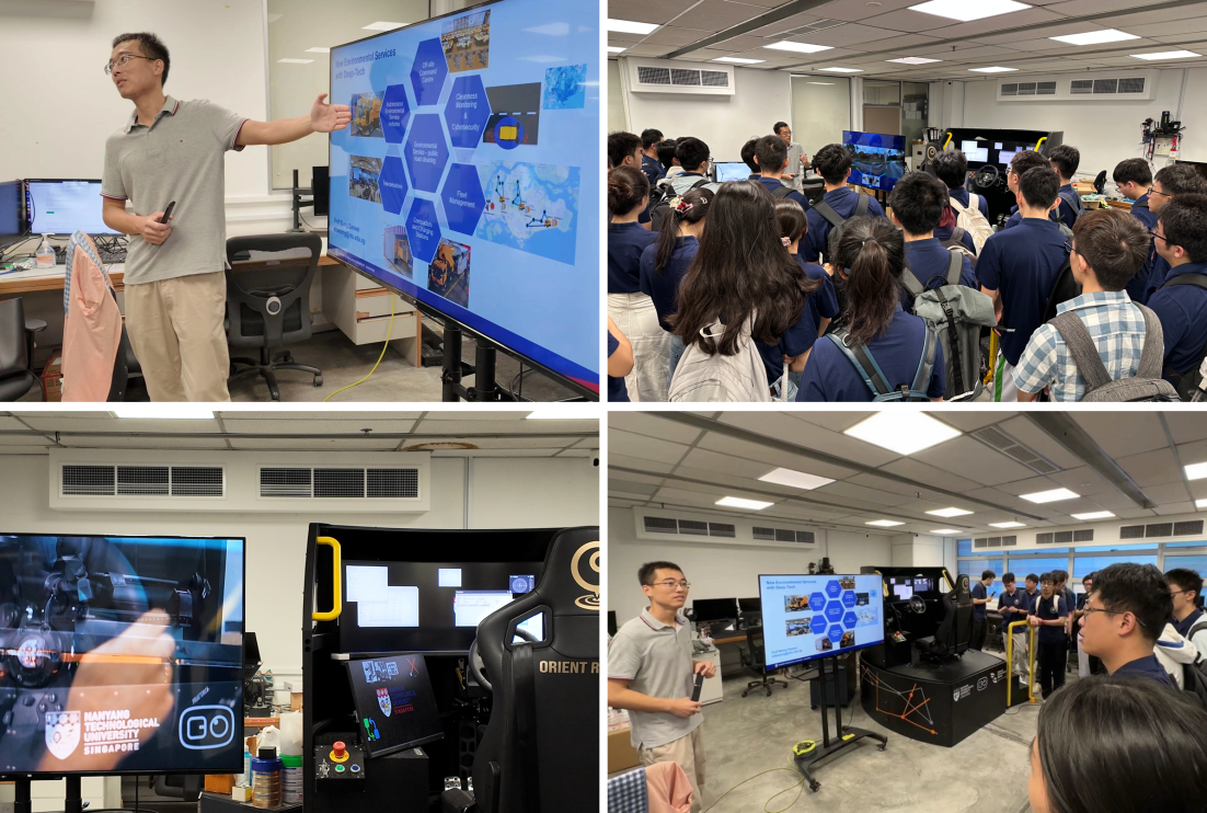 研学实践阶段在南洋理工大学开展,南洋理工大学机器人实验室王元哲教授带领同学们重点参观了南洋理工大学虚拟仿真实验室,并做《高保真度远程驾驶技术——自动驾驶汽车与机器人》的专题报告,介绍了远程驾驶平台的设计思路与测试效果,并详细讲解了传感器分布、信息检测等技术内容和该技术的多功能应用场景。在交流提问环节,同学们结合各自专业与研究方向与王教授就无人驾驶算法、通信效率、应用前景等问题进行了交流探讨,获益匪浅。