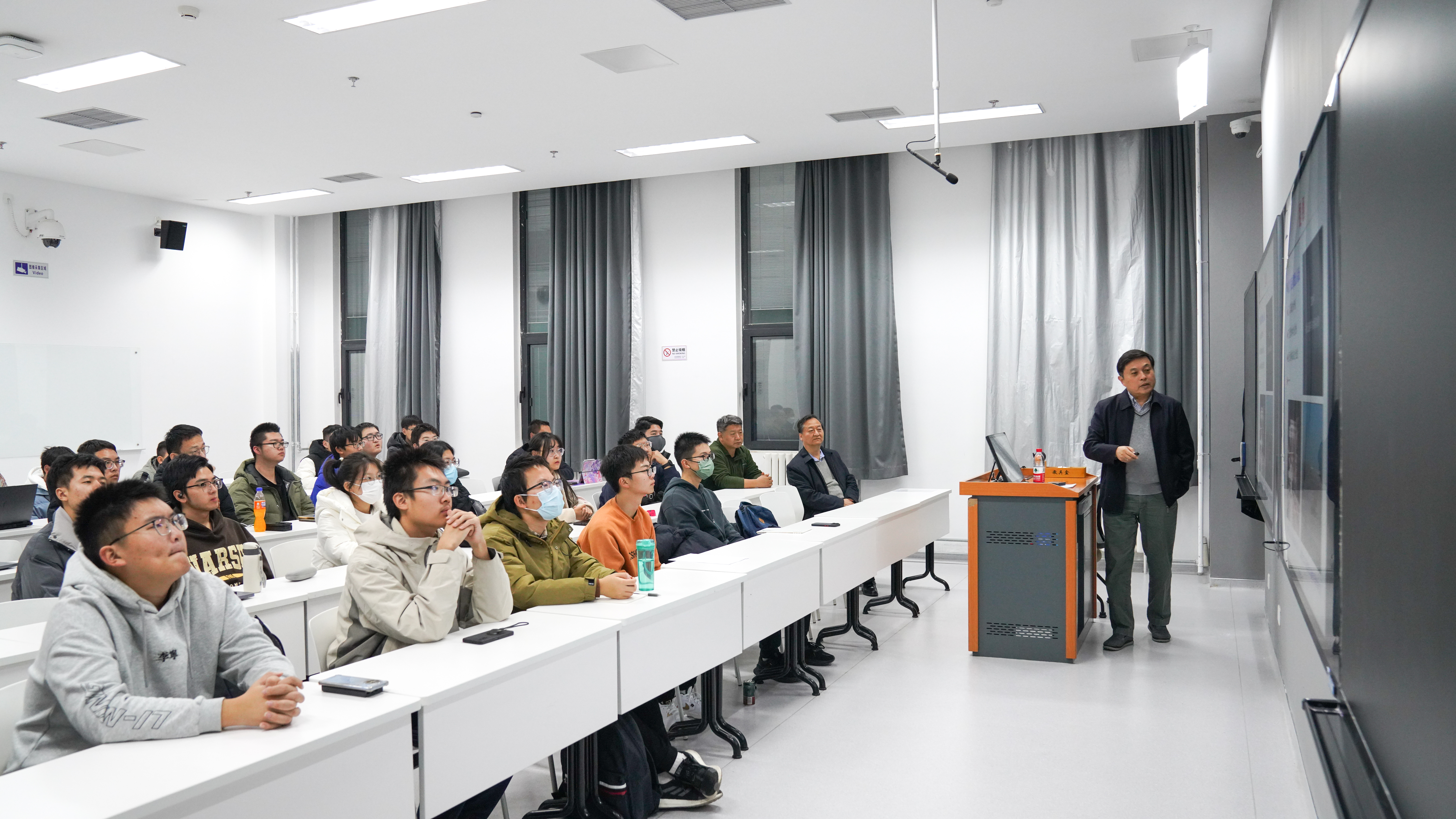 在讲解了工程科学的形成及研究方法后,胡院士围绕人工智能的发展分享了自己的科研经历和见解,从“细节是否决定成败”“机器可否超越人类”两个问题引发同学们思考与研讨。课程讲授结束后,同学们就“如何解决干扰数据对机器学习算法的影响”等问题向胡院士请教,胡院士结合实际案例进行了讲解。