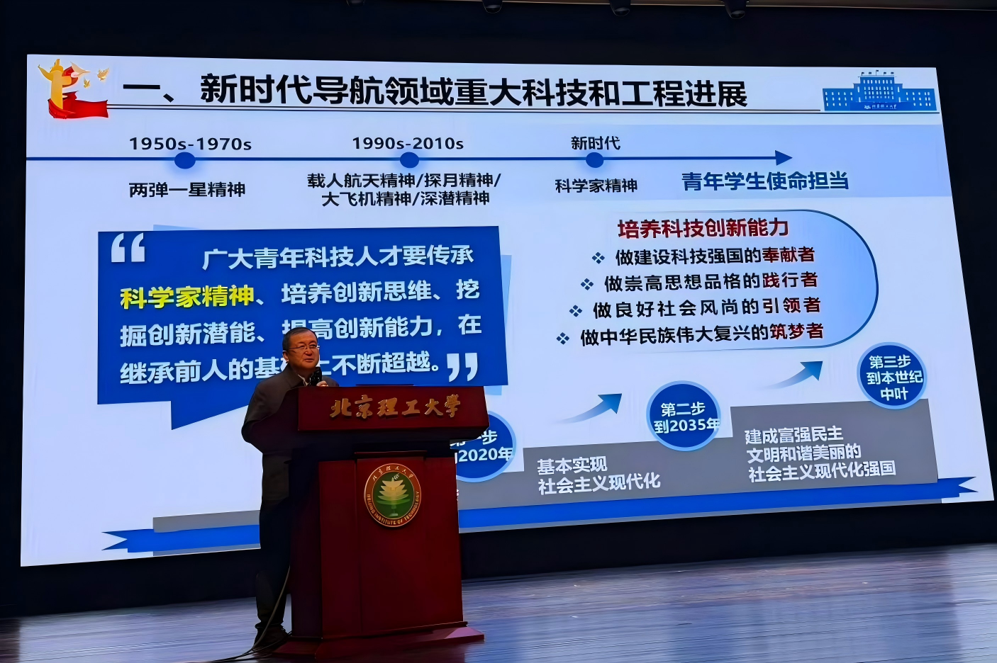 这既是一场干货满满的学术科普,更是一堂触及灵魂的思想洗礼。付梦印院士以北理工导航领域三代人的奋斗历程为主线,回顾了我国导航技术从“引进—仿制—引领”的跨越发展,深情讲述了陈峰浴、孟庆元、彭兴泉等老一辈科学家在艰苦条件下攻克寻北系统、陀螺仪等核心技术的感人事迹,深刻诠释了科技报国的初心与使命。报告强调,要推动教育、科技、人才“三位一体”协同发展,锻造具备“高快强实”品质的认知导航双领人才——即理想要高、视野要宽,反应要快、学习要快,本领要强、协作要强,作风要实、成果要实。