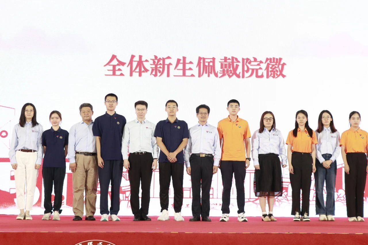 学院领导与学育导师为2023级新生代表佩戴院徽。院徽整体形象设计采用字母“T”,意指着“特立书院”要在“科技创新”领域培养“拔尖创新人才”。红蓝相接,特立潮头!鲜艳的红色体现了传承延安根、军工魂的红色基因,深邃的蓝色标明了拔尖创新人才要瞄准科技新兴前沿交叉,海阔凭鱼跃、天高任鸟飞。