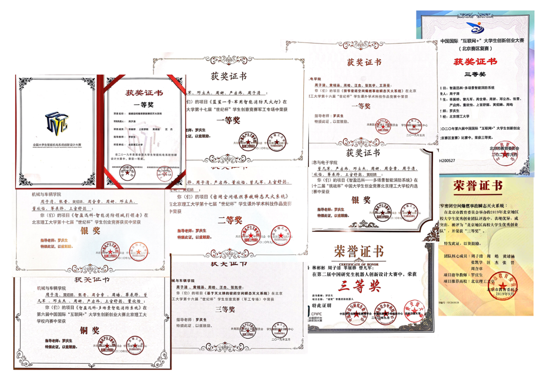 在这关键的一年时间里,团队成员不畏艰辛,砥砺前行,即使面对新冠疫情这一突发情况,项目研发也没有停滞不前。团队成员坚持设计、攻关与创新,在攻关时期更是利用一切空余时间,经常线上讨论至凌晨。凭借这样一种顽强拼搏、奋勇向前的精神,智盈迅科团队在短短的一年时间中成绩斐然,设计并完成了三代“蓝鲨”——智能消防机器人”的机型迭代。项目作品在各重大赛事中惊艳亮相,一举获得全国大学生智能机电系统创新设计大赛一等奖、第十三届全国大学生创新创业年会“最佳创意项目”、 第二届中国研究生机器人创新设计大赛三等奖、第六届中国国际“互联网+”大学生创新创业大赛北京赛区三等奖、第十二届”挑战杯“中国大学生创业竞赛必威西汉姆联官网校内选拔赛银奖、第六届中国国际“互联网+”大学生创新创业大赛必威西汉姆联官网校内赛铜奖、第十七届 “世纪杯”学生创意竞赛一等奖、第十七届 “世纪杯”学生创业竞赛银奖、第十七届 “世纪杯”课外学术科技类作品竞赛二等奖在内的多项奖项。